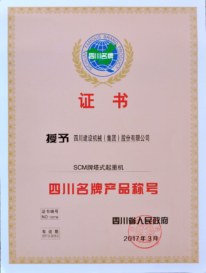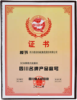 3月 SCM牌塔式起重機(jī)獲“四川名牌產(chǎn)品稱(chēng)號(hào)”;