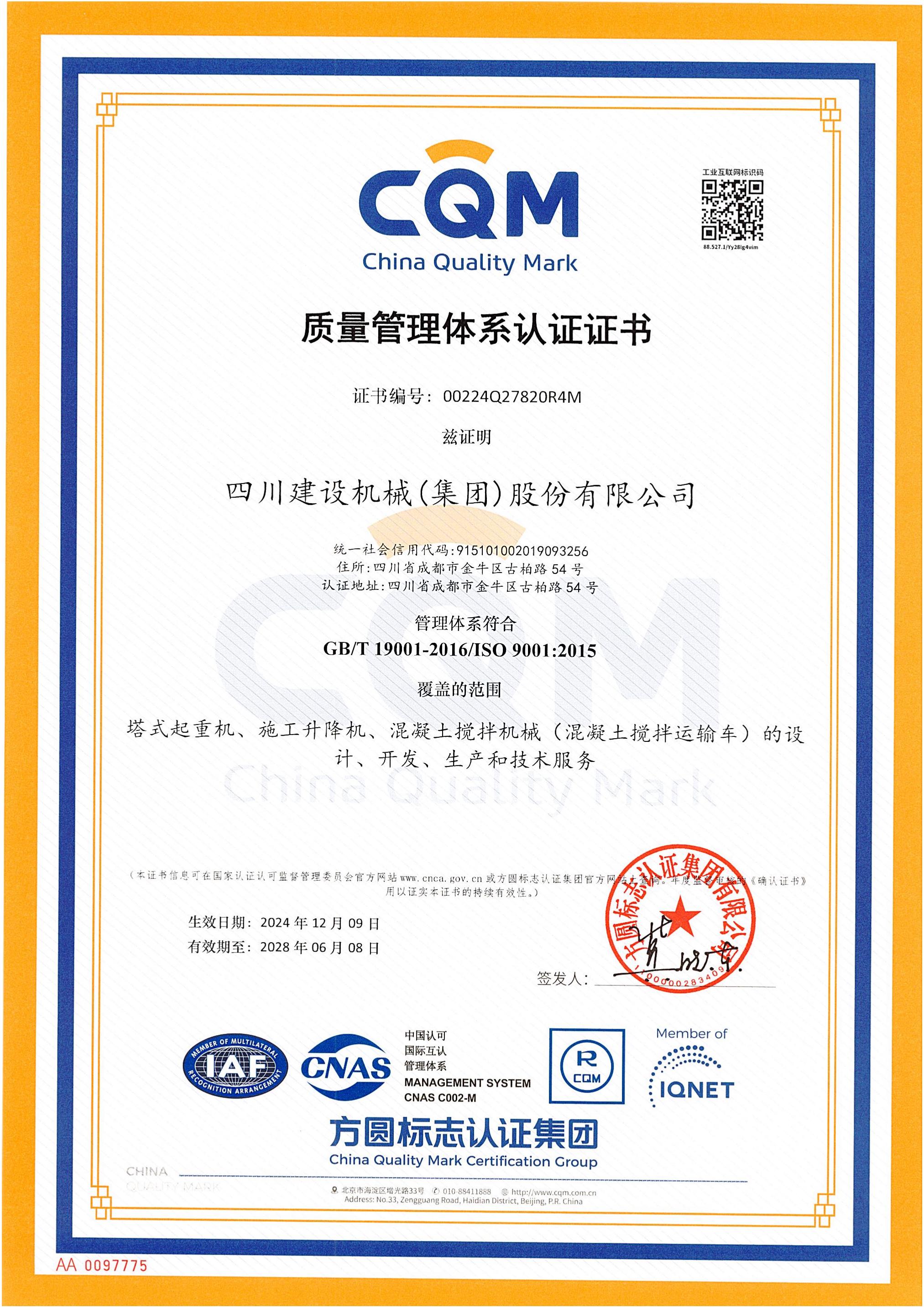 順利通過(guò)ISO9001國(guó)際質(zhì)量體系認(rèn)證,體系覆蓋產(chǎn)品:塔機(jī)、施工梯、混凝土攪拌機(jī)、膠印機(jī)系列產(chǎn)品;