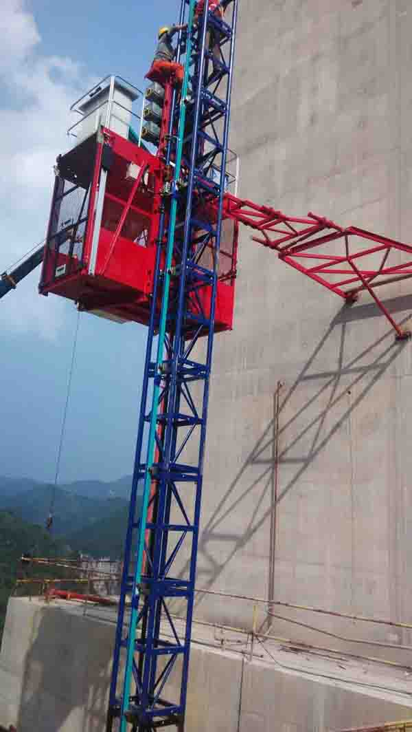 用于載人和提升物件的兩臺施工升降機配置高度均為248米,3×15kW三電機驅(qū)動,額定提升速度0~55 m/min,電纜形式采用滑觸式,解決了超高施工升降機的電纜自重負荷問題。