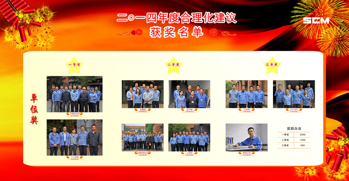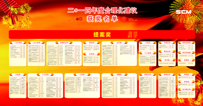 2014年期間,(集團)公司共收到合理化建議238條,其中170條被公司采納,為了鼓勵員工積極參與合理化建議活動,公司對2014年度的合理化建議活動進(jìn)行評比表彰,經(jīng)討論評定評選出單位一等獎2名,二等獎4名,三等獎3名,提案一等獎2個、二等獎9個、三等獎135個、鼓勵獎70個,予以表彰。