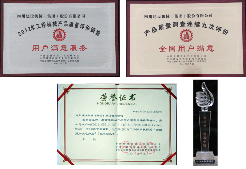 會(huì)議上,侯寶佳秘書(shū)長(zhǎng)公布了用戶滿意產(chǎn)品、滿意服務(wù)企業(yè)及塔機(jī)用戶滿意十強(qiáng)等評(píng)選名單,對(duì)到會(huì)的企業(yè)代表及個(gè)人進(jìn)行了現(xiàn)場(chǎng)表彰,并對(duì)連續(xù)三次以上獲得用戶滿意產(chǎn)品稱號(hào)的企業(yè)進(jìn)行表彰。四川建設(shè)機(jī)械(集團(tuán))股份有限公司在2012年工程機(jī)械產(chǎn)品質(zhì)量評(píng)價(jià)調(diào)查中獲得“用戶滿意服務(wù)”,迄今為止已經(jīng)是(集團(tuán))公司產(chǎn)品“質(zhì)量調(diào)查連續(xù)九次評(píng)價(jià)全國(guó)用戶滿意”。公司生產(chǎn)的C5013、C5510、C5513、C6018、C7022、C7030、C7050、M900、M1500塔式起重機(jī)以及SC200/200施工升降機(jī)被評(píng)為“全國(guó)用戶滿意產(chǎn)品”。同時(shí),協(xié)會(huì)在用戶滿意產(chǎn)品的基礎(chǔ)上評(píng)選出2012年塔式起重機(jī)行業(yè)“全國(guó)塔機(jī)用戶滿意十強(qiáng)”企業(yè),包括四川建設(shè)機(jī)械(集團(tuán))股份有限公司、撫順永茂建筑機(jī)械有限公司、中聯(lián)重科股份有限公司、廣西建工集團(tuán)建筑機(jī)械制造有限責(zé)任公司、北京永茂建工機(jī)械制造有限公司、沈陽(yáng)三洋建筑機(jī)械有限公司、浙江省建設(shè)機(jī)械集團(tuán)有限公司、湖北江漢建筑工程機(jī)械有限公司、浙江虎霸建設(shè)機(jī)械有限公司、江蘇正興建設(shè)機(jī)械有限公司。