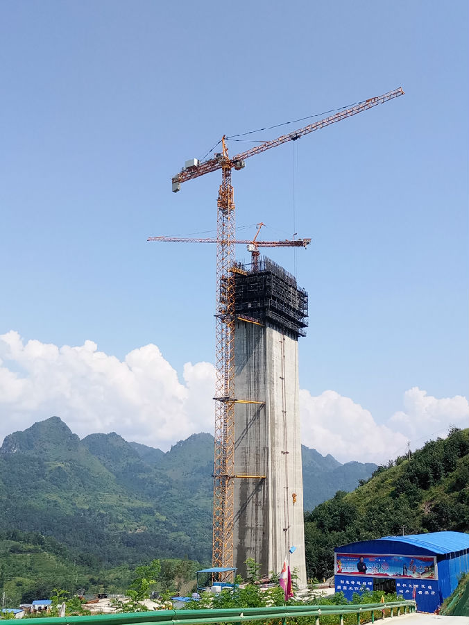 平塘特大橋?qū)儆谛崩瓨虻囊环N,橋塔由混凝土修建,索塔將建設(shè)成鉆石形空間塔,即全橋立三個巨型塔體,每座塔的造型均為兩個倒A字形的塔柱組合而成,在三個塔的兩面又分別架設(shè)數(shù)十組不銹鋼鋼索,遠(yuǎn)處觀摩,整座橋好似三顆金光閃閃的巨型“鉆石”鑲嵌在大橋上,非常的雄偉、瑰麗。其中最大的塔體塔高為328米,這個高度相當(dāng)于110層高樓,在大橋完工后就將成為高混凝土橋塔的世界第一;在不分橋型的情況下,平塘特大橋的塔高將刷新已建成的橋梁,將成為亞洲第一高橋。